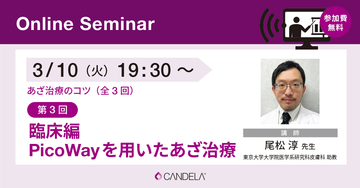 1月~3月にかけて、東京大学大学院医学系研究科皮膚科 尾松 淳先生による 『あざ治療のコツ』 を3回シリーズでお届けします。最終回となる今回は 「臨床編 PicoWayを用いたあざ治療」 です。ぜひご参加ください。