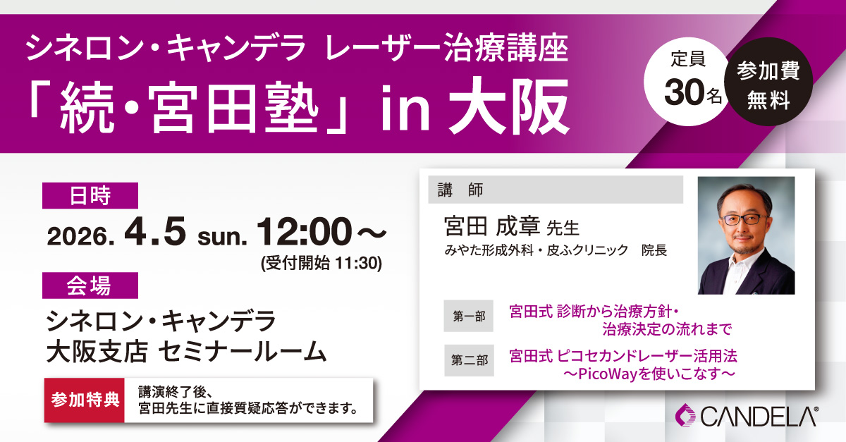 この度、みやた形成外科・皮ふクリニック院長 宮田成章先生をお招きし、シネロン・キャンデラ レーザー治療講座「続・宮田塾」を大阪にて開催する運びとなりました。