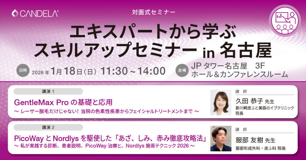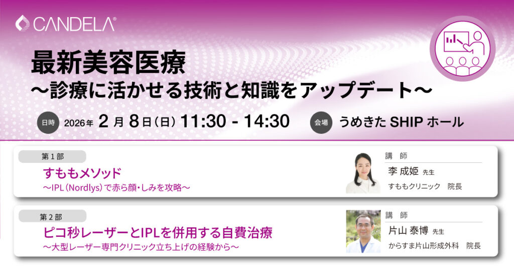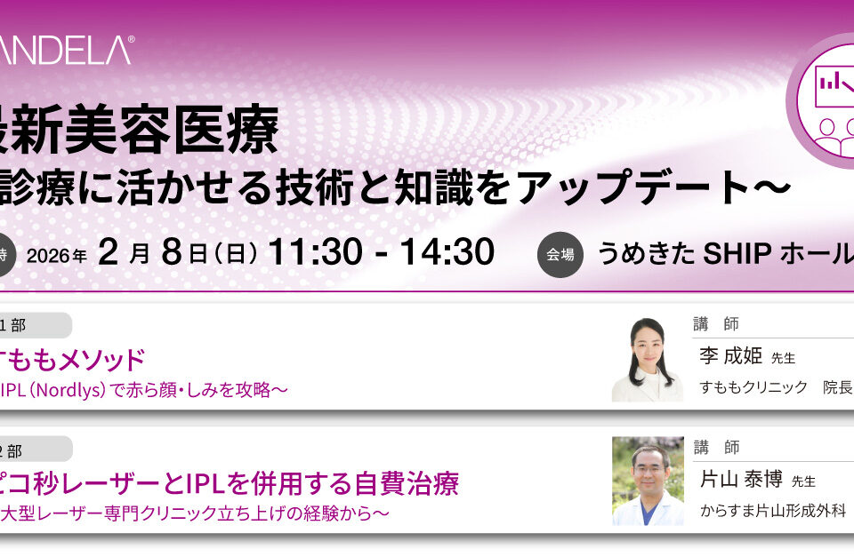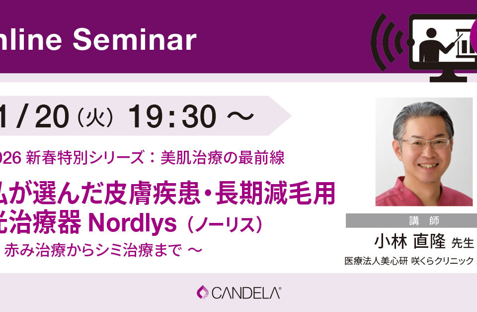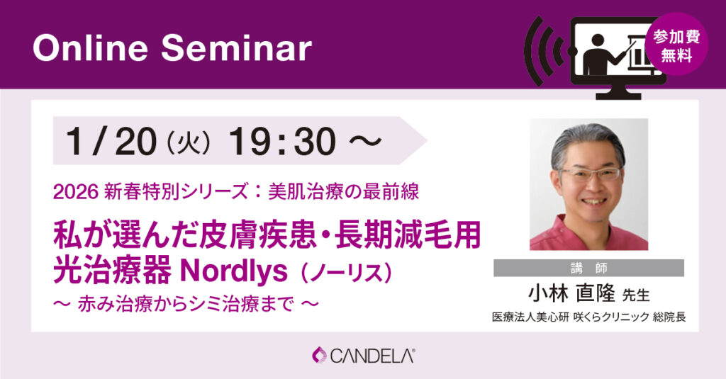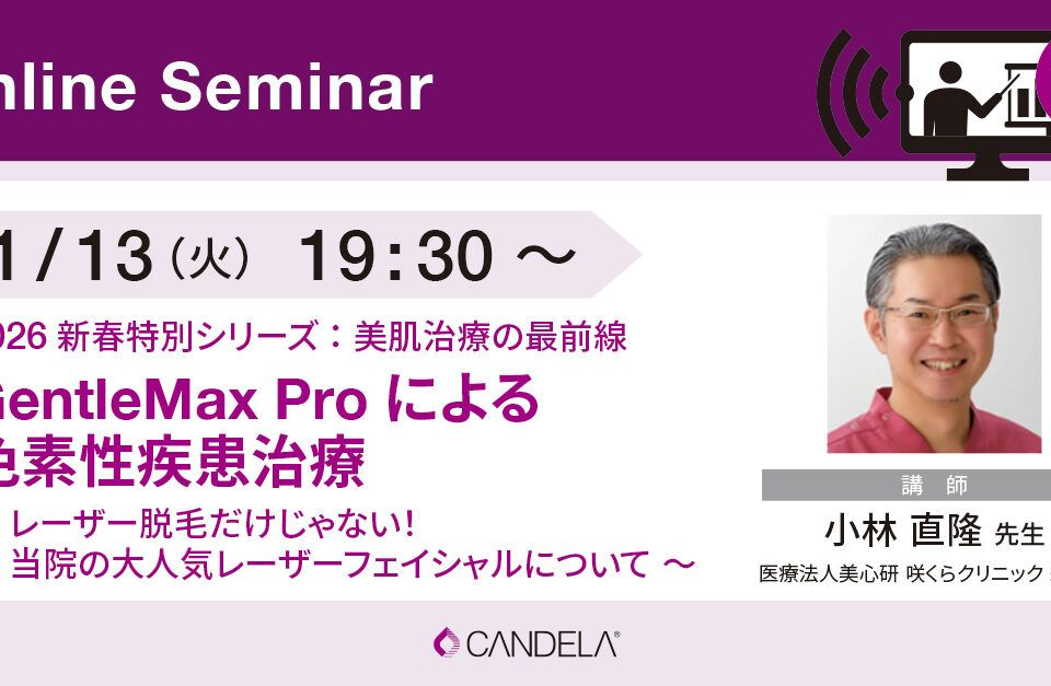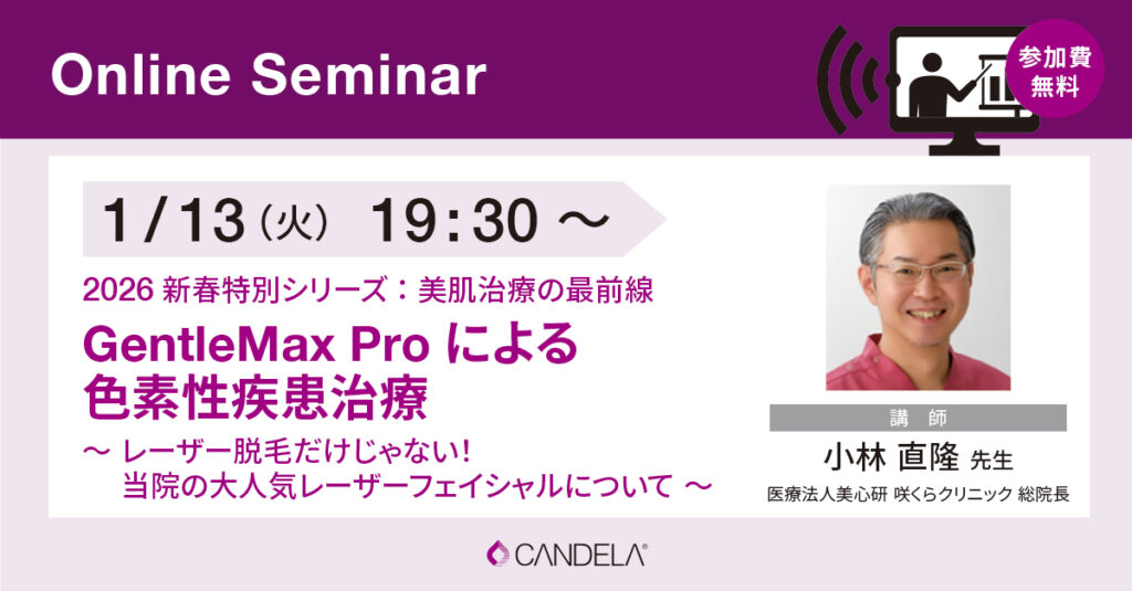 2026年、最初のオンラインセミナーとなる今回は、咲くらクリニック 総院長 小林 直隆 先生に「GentleMaxProによる色素性疾患治療」についてご講演いただきます。咲くらクリニック様で大人気の「レーザーフェイシャル」にフォーカスをした、実診療お役立ていただける内容となっております。是非、ご参加ください。