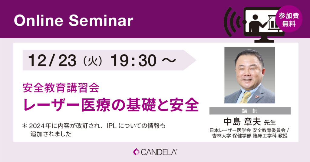 本セミナーは、日本レーザー医学会により作成されたレーザー安全教育講習会の動画配信となります。放映する動画は、弊社レーザー装置のご使用に際し必要な座学として、基礎的事項の要点のみを短時間で講習することを目的としています。その受講が日本レーザー医学会主催の定例安全教育講習会(約3時間)の受講に代わるものではありませんのでご了承ください。また、2024年に内容が改訂され、IPLについての情報も追加されました。